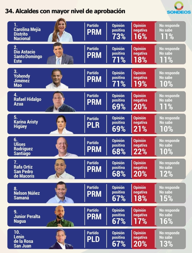 Santo Domingo, DN.– La alcaldesa del Distrito Nacional, Carolina Mejía, encabeza el ranking de aprobación entre los alcaldes de la República Dominicana, tras alcanzar un 73 % de opinión positiva, según una reciente encuesta realizada por la firma Sondeos.