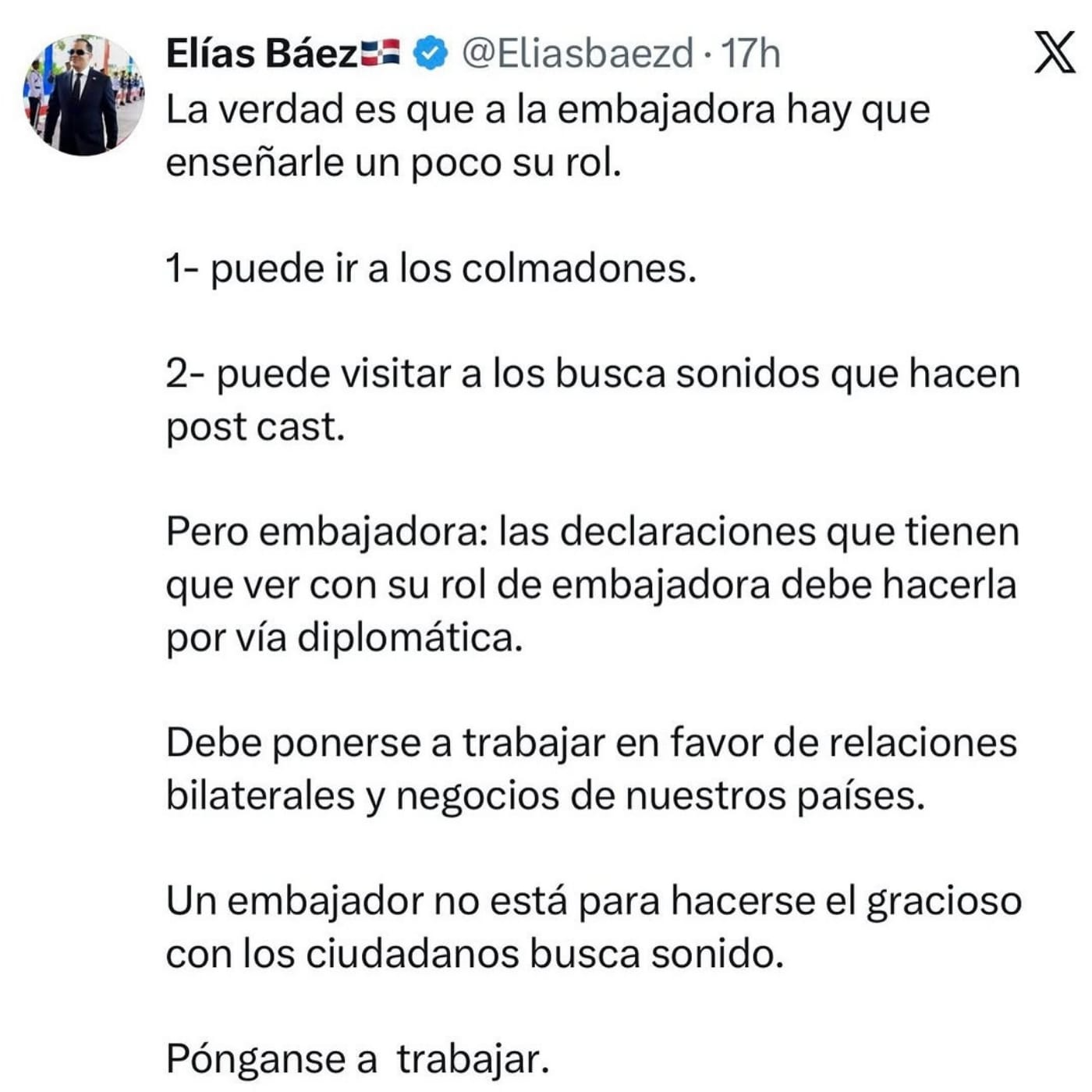 El funcionario también indicó que, a su juicio, un embajador no debe interactuar de manera informal con la ciudadanía en temas que no corresponden al ejercicio tradicional de la diplomacia.